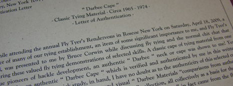 Several years ago, while at a Catskill Fly Tiers Guild swap meeting in Roscoe, NY, I noticed a small, but well feathered neck on a table. It interested me because it was backed with newspaper, a common practice among some breeders back in the day, as well as being a lovely ginger color. The neck remained sealed in plastic until this past April when I had the good fortune to be tying at the Annual Fly Tier’s Rendezvous in Roscoe. Dave Catizone of Catskill Creations, a noted historian, authenticator and appraiser of classic catskill collectibles, was sitting opposite me at the table. I placed the neck in front of him and that was all it took. He inspected the neck and after a detailed examination and note taking session, proclaimed it a genuine Darbee cape “from the flock of selected Rooster Cocks developed by Harry Darbee”. I made arrangements with Dave to receive a full, documented appraisal that arrived by mail week later. Dave does an exceptional job with both the appraisal and it’s presentation in full presentation folder on beautiful stock. The story was a virtual history of genetic hackle and Harry Darbee’s contributions. I’ve since mounted the neck in an air tight enclosure to protect it against all would be invaders. After reading Dave’s full 2 page authentication letter, I was moved to reread Catskill flytier: My life, times, and techniques... The “Darbee Book”. I would highly recommend Dave Catizone for any and all authentication questions. I feel fortunate to have a small piece of fly tying history in my collection. So keep your eyes open... those wonderful finds are out there waiting to be discovered.
